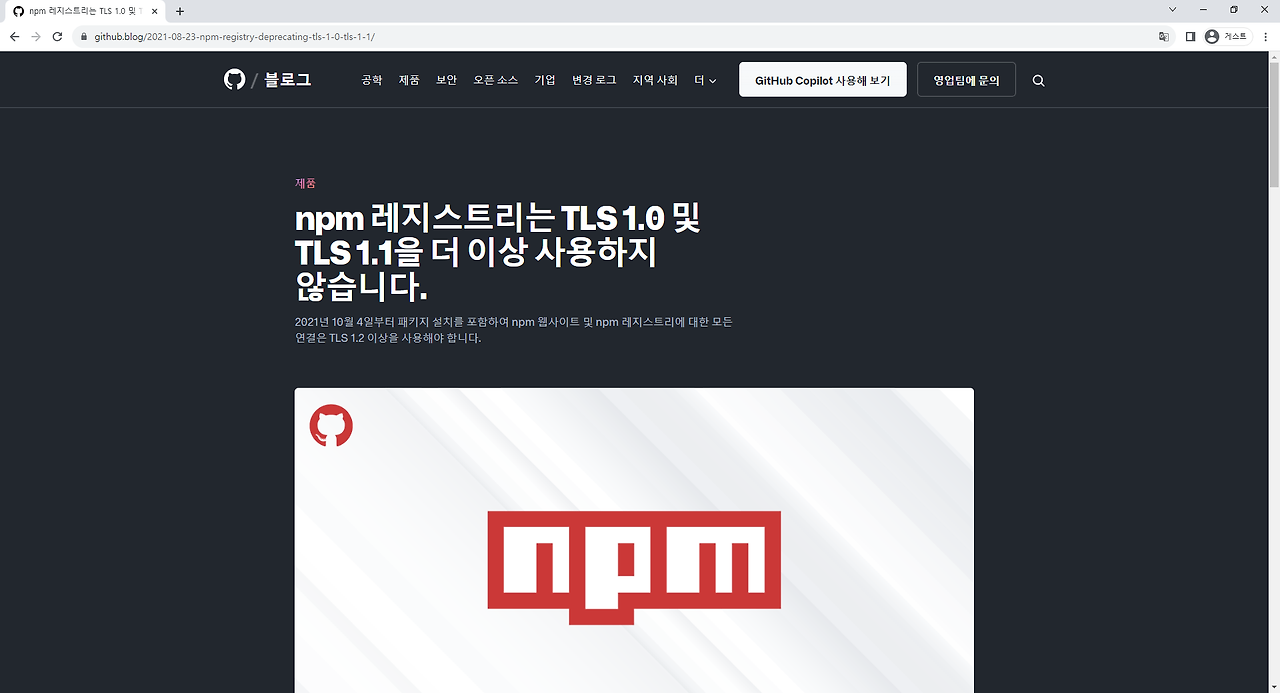 정확히는 2021년 10월 4일부터 패키지 설치를 포함하여 npm 웹사이트 및 npm 레지스트리에 대한 모든 연결은 TLS 1.2 이상을 사용해야 한다는 뜻이다.